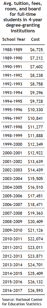 Even though sticker prices are often discounted, those prices remain the “baseline“ from which any institutional aid will be subtracted. Therefore, increases in sticker prices are a reliable indicator of the pace at which the cost of attending college is rising. The table at right shows the increases in average annual sticker prices over the past 30 years — at a rate nearly three times that of overall inflation.
